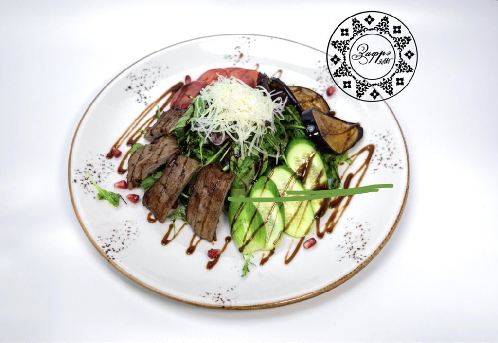 Салат "Теплый из телятины" 690 руб. В корзину 200гр. 200гр. Описание Описание (Мякоть телятины, баклажаны, свежие помидоры, огурцы, микс салат, айсберг, гранат, оливковое масло, бальзамический соус)