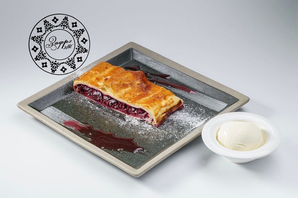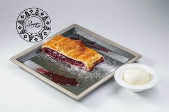 Штрудель «Вишневый» 380 руб. В корзину 180гр. 180гр. Описание Описание (Запеченный нежный десерт с вишней, подается с соусом, мороженное, мята)