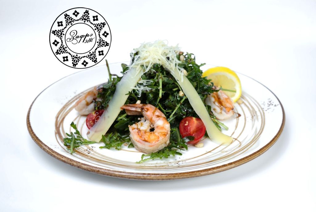 Салат "Руккола" с тигровыми креветками 720 руб. В корзину 200гр. 200гр. Описание Описание (Листья рукколы с томатами черри, заправленные бальзамическим соусом с обжаренными на гриле тигровыми креветками и сыром Пармезан)
